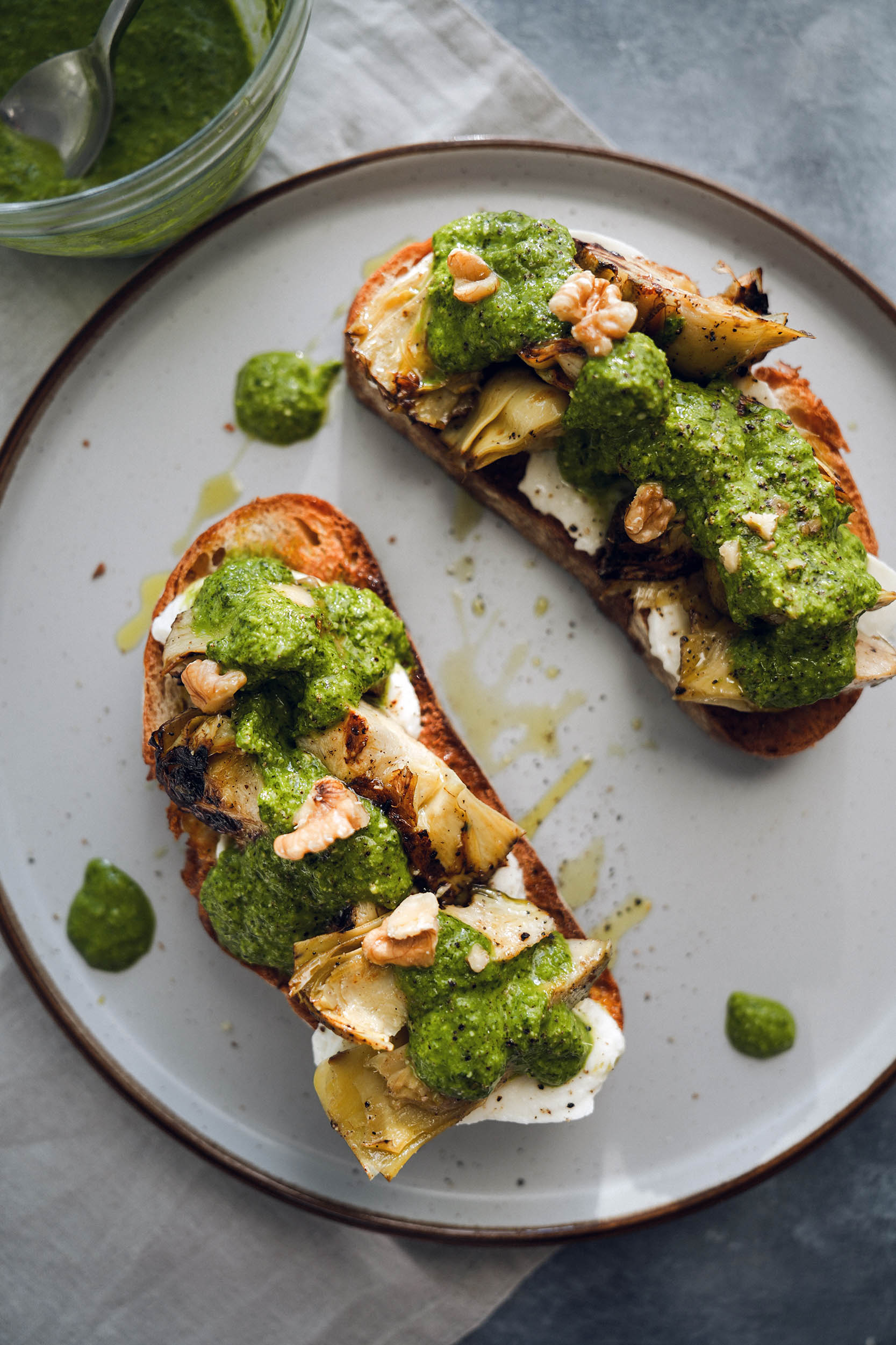 Niektóre przepisy mają w sobie coś z magii – kilka składników, chwila na przygotowanie i gotowe danie, które wygląda i smakuje jak z dobrej kawiarni. Te grzanki to dokładnie taki przypadek. Chrupiące pieczywo, podsmażane karczochy, ciągnąca się mozzarella i domowe pesto – wszystko pasuje tu idealnie. Prosto, sezonowo i naprawdę pysznie.