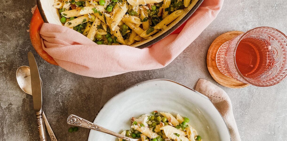 Dodajemy szynkę i smażymy około 3-4 minuty. Doprawiamy bardzo lekko solą oraz pieprzem. W międzyczasie gotujemy makaron (al dente). Do szynki wlewamy wino, a po chwili crème fraîche. Całość mieszamy. Na koniec dodajemy ser gorgonzola, groszek oraz makaron i garstkę startego parmezanu. Całość mieszamy do rozpuszczenia się sera. Wykładamy na talerze i dodatkowo posypujemy startym parmezanem oraz natką.