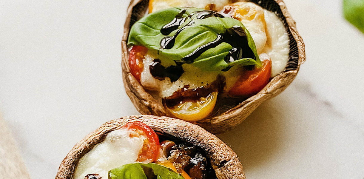 Z pieczarek portobello usuwamy ogonki, smażymy je na maśle, wraz z 3 startymi ząbkami czosnku oraz solą i pieprzem. Na pieczarkach układamy pomidorki, przesmażone ogonki z czosnkiem i ser mozzarella. Zapiekamy do rozpuszczenia się sera. Dekorujemy bazylią oraz glazurą. Smacznego.
