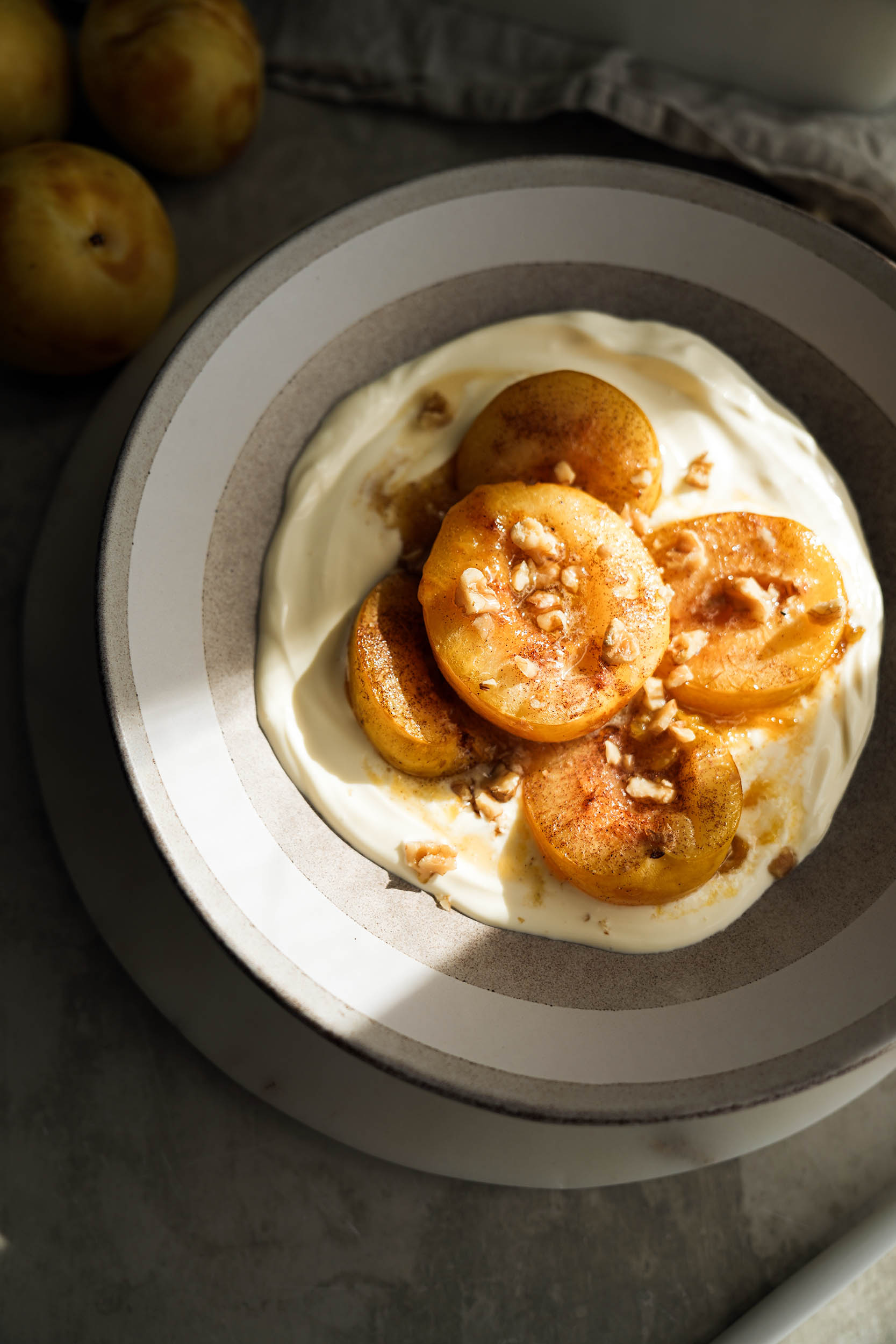 - Podawaj od razu – na talerzu rozsmaruj łyżkę crème fraîche, ułóż ciepłe śliwki i posyp chrupiącą posypką.