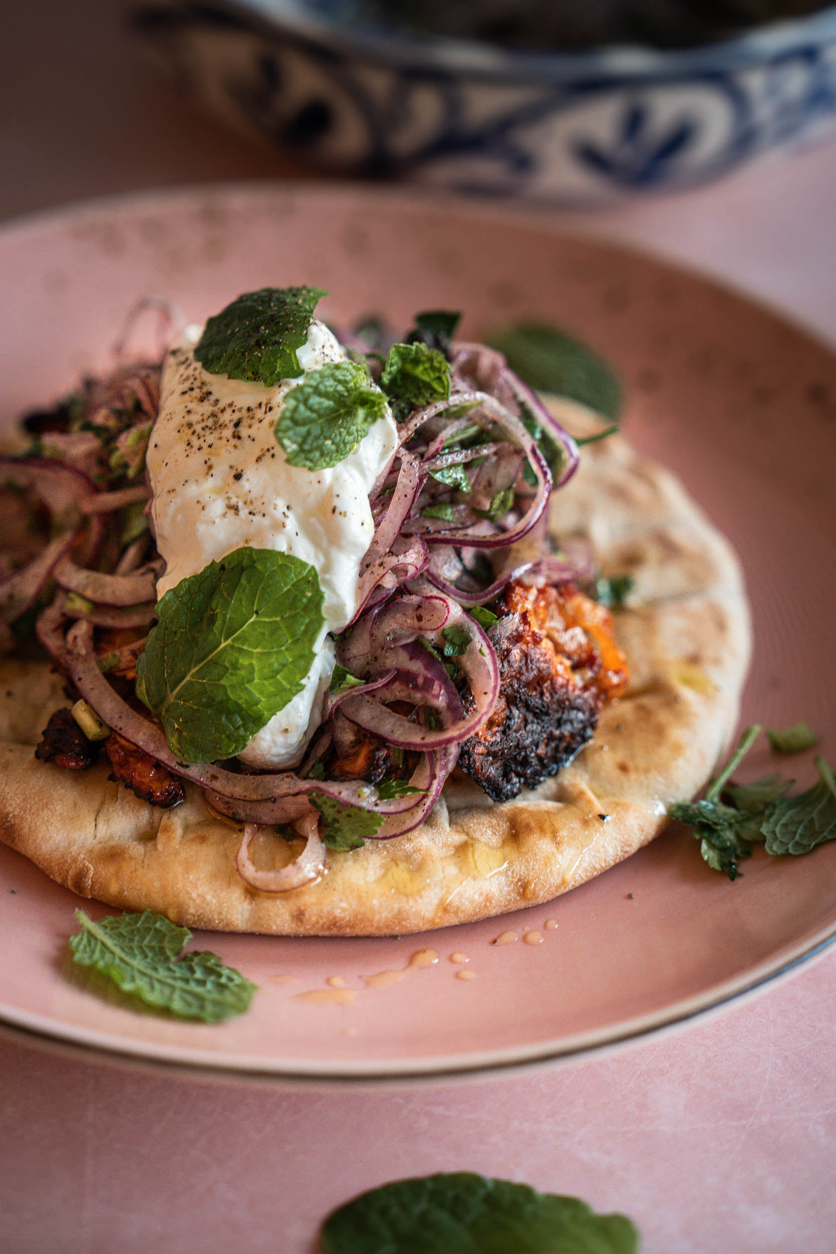 - Pitę podpiecz na suchej patelni lub w piekarniku, aż będzie ciepła i lekko chrupiąca.