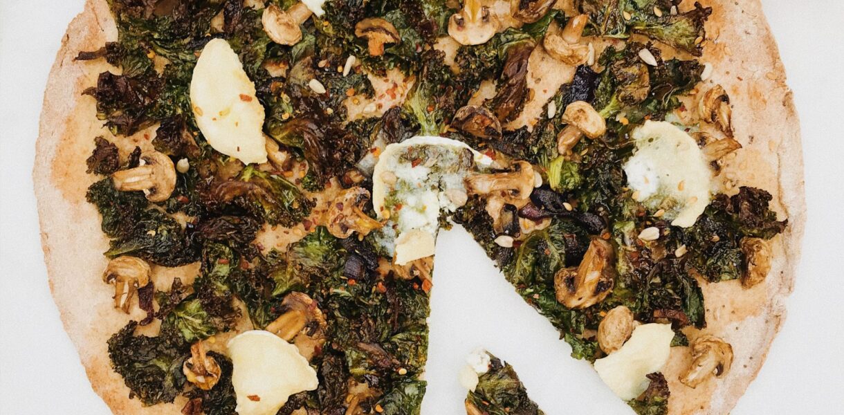 Na gotowym placku układamy jarmuż, potem pieczarki oraz plasterki sera. Pieczemy 10 minut w piecu nagrzanym do 220°C, najlepiej na kamieniu bądź też na okrąglej blasze z dziurkami do pizzy. Jeśli nie mamy, możemy potrzebować paru minut dłużej na upieczenie.