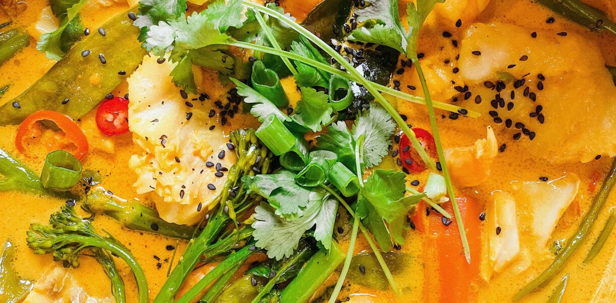 W dłużnym, żeliwnych garnku rozgrzewamy olej kokosowy i wrzucamy czosnek, świeżą kurkumę, kurkumę w proszku, trawę cytrynową, listki limonki oraz imbir. Mieszamy chwilę, około 2-3 minuty, a następnie zalewamy bulionem oraz mlekiem kokosowym. Dodajemy brokuły, marchewkę i groszek cukrowy oraz 2 chili pokrojone w plasterki. Gotujemy kolejne 2 minuty. Następnie delikatnie wkładamy filety ryby i krewetki, tak aby lekko były zanurzone. Już nie mieszamy curry, możemy delikatnie poruszać garnkiem. Gotujemy około 5-7 minut. Doprawiamy sosem rybnym. Curry podajemy z ryżem. Przed podaniem dekorujemy szczypiorkiem, chili, sezamem oraz kolendrą. Jeżeli sos wydaje nam się za mało gęsty, możemy zagęścić wodą z mąką ziemniaczaną.