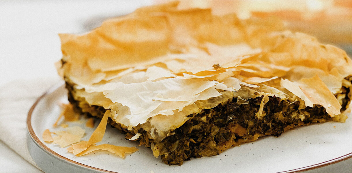 Obraną i posiekaną w piórka cebulę smażymy na oliwie wraz z odrobiną soli i pieprzu do miękkości, uważając, aby się nie przypaliła. Możemy też dodać odrobinę wody. Gdy cebula jest już miękka, dodajemy odsączony z wody szpinak. Całość chwilę smażymy do polaczenia się smaków. Wyłączamy z ognia i dodajemy pokruszony ser, jajko, śmietanę oraz orzechy. Dokładnie mieszamy. Doprawiamy do smaku w razie potrzeby. Duże naczynie żaroodporne smarujemy masłem na dnie za pomocą pędzelka i układamy po kolei płaty ciasta filo, każdy z osobna smarując masłem, tworząc spód dla nadzienia. Kiedy zużyjemy połowę ciasta, układamy nadzienie, a następnie kontynuujemy układanie płatów, dokładnie smarując masłem. Wystające brzegi ciasta układamy pod spod, tak aby zapobiec zbytniemu wyschnięciu ciasta podczas pieczenia. Pieczemy w temperaturze 180°C przez 45-50 minut do momentu aż góra będzie pięknie złota i chrupiąca.